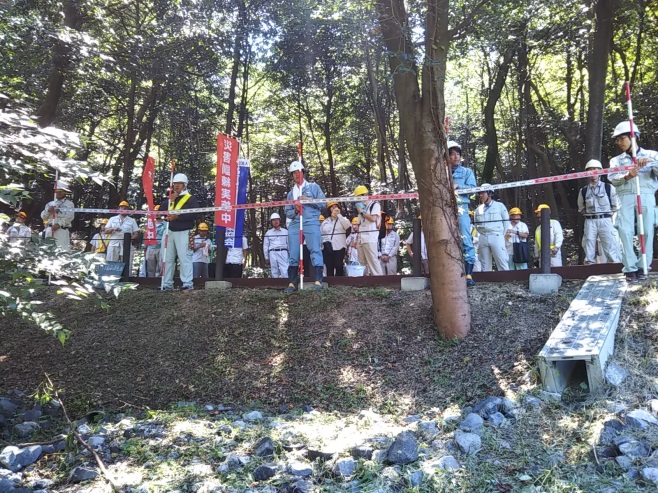 7月22日開催の名古屋市合同災害対策技術研修会に参加した方々総勢89名により、道路法面(切土)崩壊、河川法面崩壊を想定し、ポール横断測量及び崩壊写真撮影の実地訓練及び被災後を想定した1級基準点測量標の状況調査の訓練を行いました。